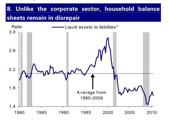 Chartet nedan visar Amerikanarnas ratio mellan likvida tillgångar (aktier, räntor, cash etc) och skuldsättning.