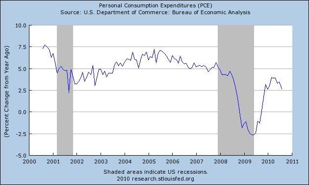Nedan är grymt intressant. Se hur personal expenditures låg på 5-7,5% YoY growth under de belåningsdopade åren 2003-2007. Min gissning är att YoY kommer ligga mellan 0-5% kommande år, eller åtminstone fram till Loan/Home value ratio är återställd, och consumer confidence åter är stark.