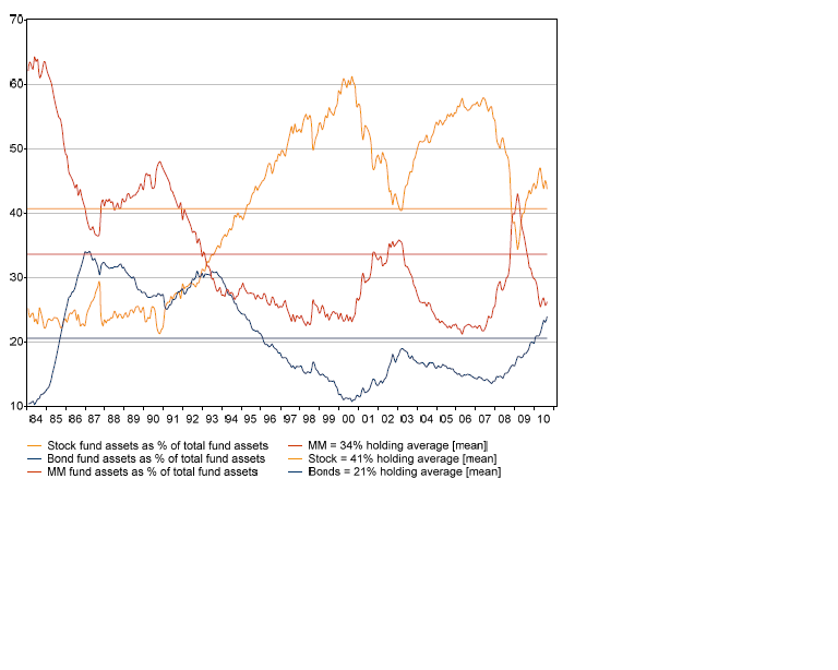 På toppen 2007 hade man ca 60% i aktier, 15% i långa obligationer och 20% i moneymarket funds… typ korträntefonder som inte yieldar nåt. Hur ska man tolka detta… jo när aktier väger mindre än 40% är det underloved, och över 55% over loved… idag är vi närmare underloved än overloved.