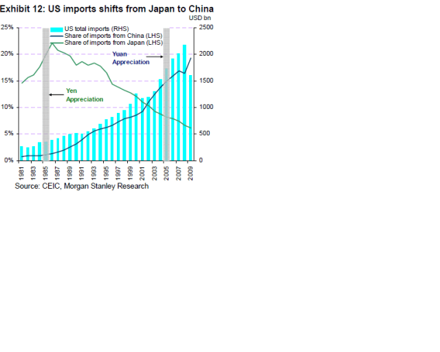 En viktig bidragande faktor till Japanska krisen, var att US flyttade sina inköp från Japan till Kina. En manöver som dessutom triggades av Yenens förstärkning. Kineserna är därför försiktiga med att revalvera sin valuta…