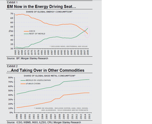 För första gången är det tvärtom. Råvarupriserna går upp trots deras svaghet, och förklaringen är enkel. EM är idag storkunden av exempelvis basmetaller. Detta trycker upp priserna.