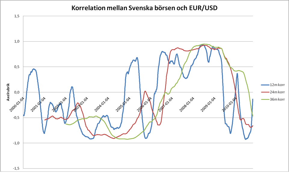 det snabba svaret är att korrelationen är 0,26. Det vill säga att de finns nästan inget samband mellan det senaste årets dollarutveckling och det kommande året på Svenska börsen.