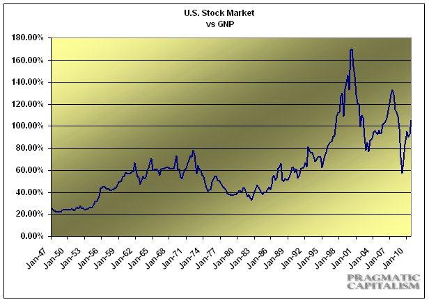 Allas vår Warren sa 2001 att hans favo verktyg för förstå om marknaden är generellt övervärderad eller ej är att titta på Mcap av Amerikanska börsen i förhållande till GNP