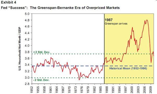 Greenspan och Bernanke är verkligen hängivna ”tillgångs haussare”, och det är klart, i en ekonomi där folk har mycket lån är ju det underliggande värdet på tillgångarna relevant. Om detta samband säger nåt om tillväxt och utveckling är mer oklart!