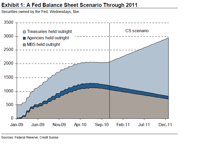 Enligt CreditSuisse kommer FEDs balansräkning se ut så här nästa år…nedgång av bolånerelaterade skulder, och en j-a uppgång av statspapper!