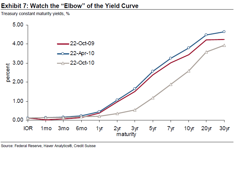 Hur ser man bevis på att marknaden prisar in QE… se chart nedan. För ett år sedan låg 2-åringen på 1% ränta. Idag ligger nästan 5 åringen på 1%. Om ett halvår kanske 1% ligger på 7år????? När QE börjar bita kommer FED dra tillbaka stimulansen, och detta kommer att synas genom att den grå kurvan går mot de röda/blå… dvs 1% är inte femåringen utan på 2 åringen. 5 åringen blir dyrare. 10 åringen stiger också. Korträntorna, dvs 2 år och nedåt kommer inte att börja stiga förrän man slutar med QE och marknaden börjar tro på räntehöjningar.