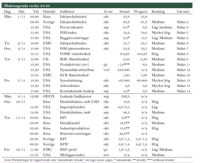 • Måndagen den 1 november presenteras det en mängd inköpsindexar (PMI-indexar) för oktober. Dessa indexar brukar få stora effekter på de finansiella marknaderna om de avviker från marknadens förväntningar. Vi tror att inköpsindexarna från Kina, USA och Sverige kommer vara viktigast den här gången.
