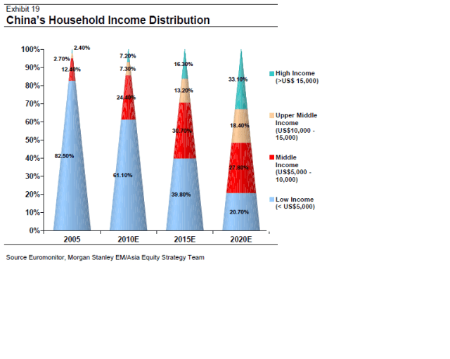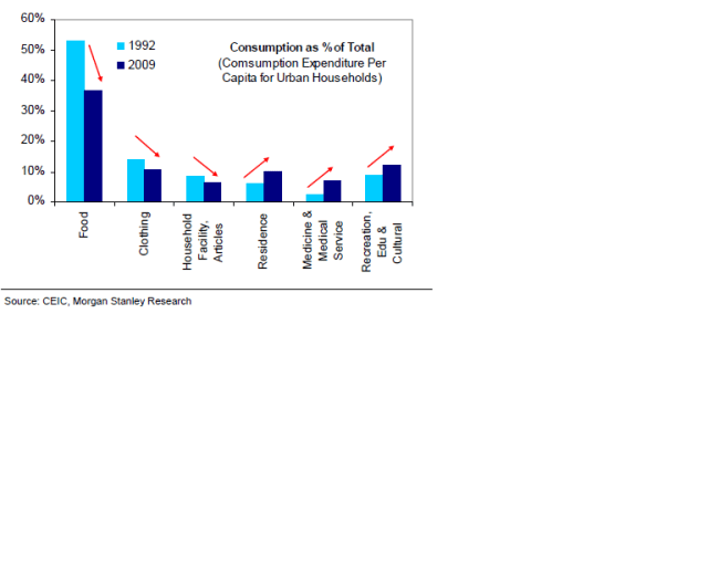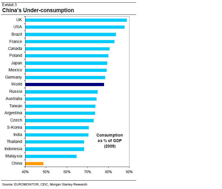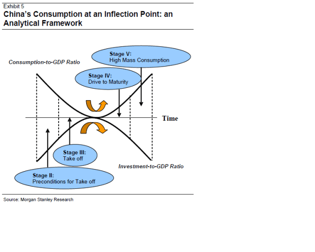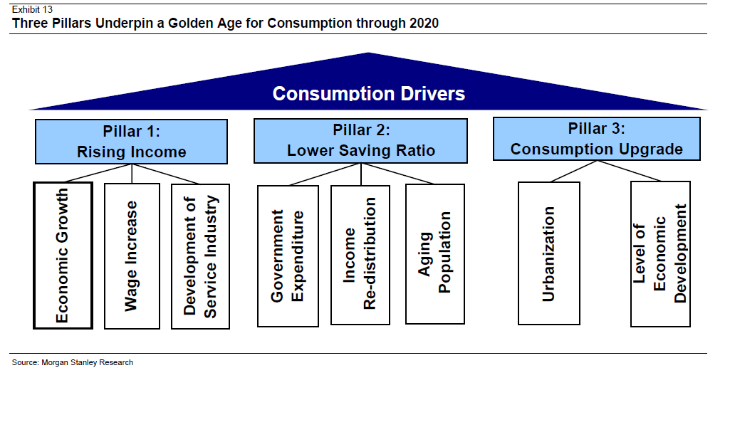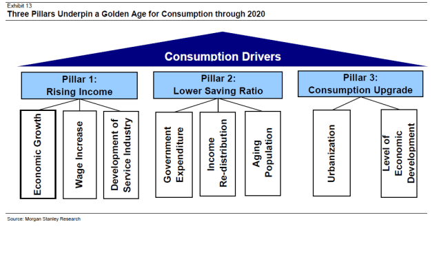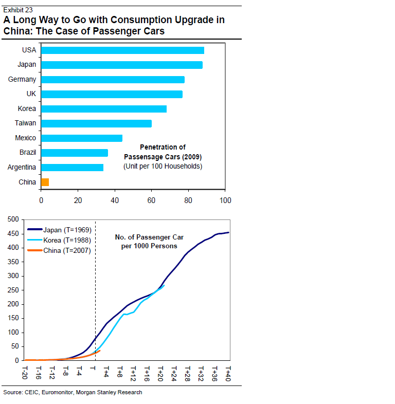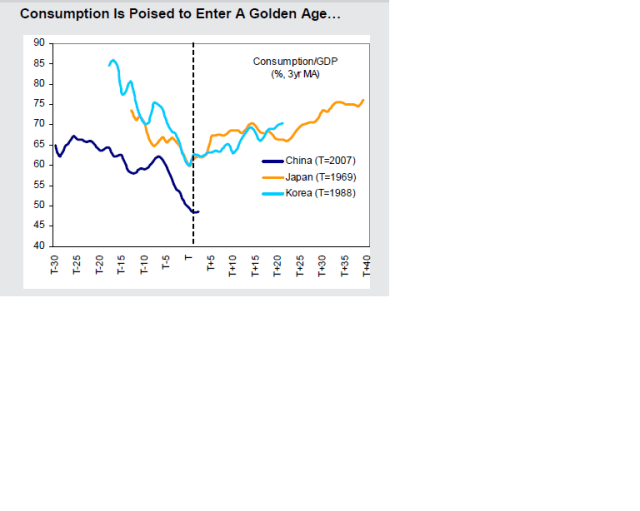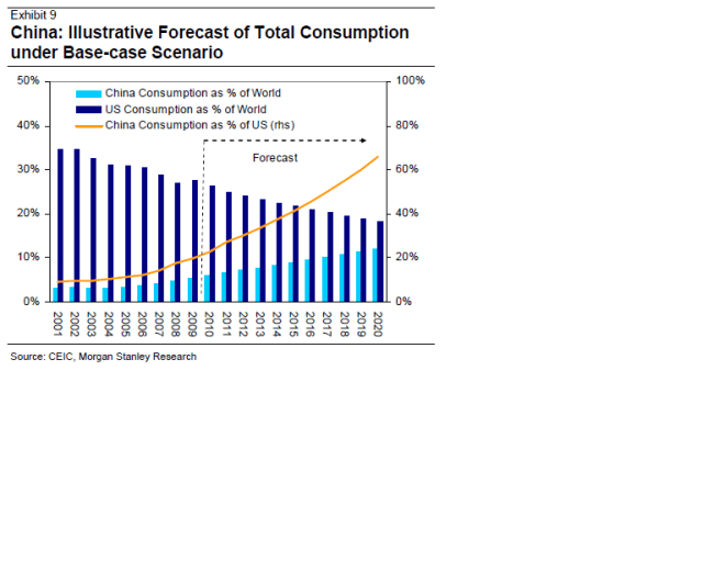 Morgan Stanley tror att Kina befinner sig på samma ställe som Japan 1969 och Korea 1988 sett till Consumption/GDP. Det är enorma krafter det handlar om, som behövs med tanke på att konsumtionstillväxten i USA de kommande 10 åren knappast kommer likna den vi har sett de senaste 10 åren.