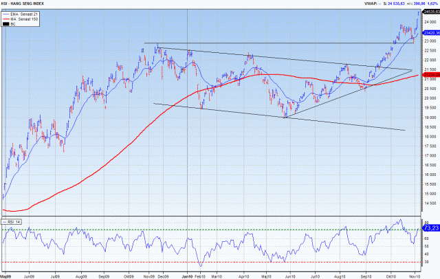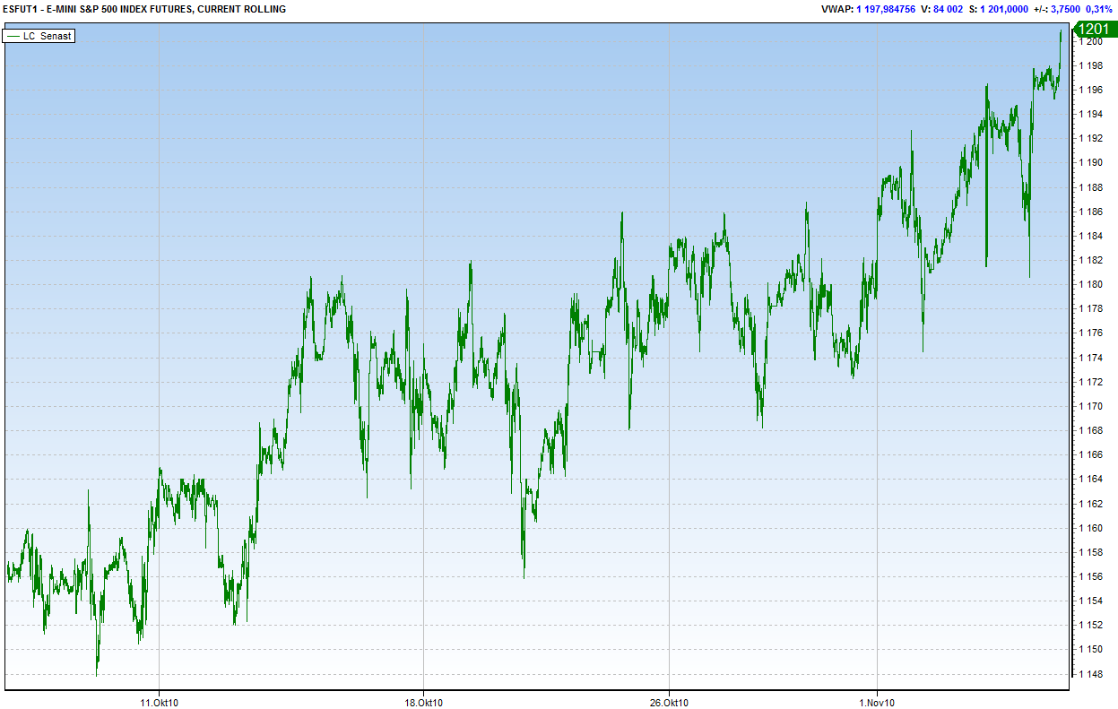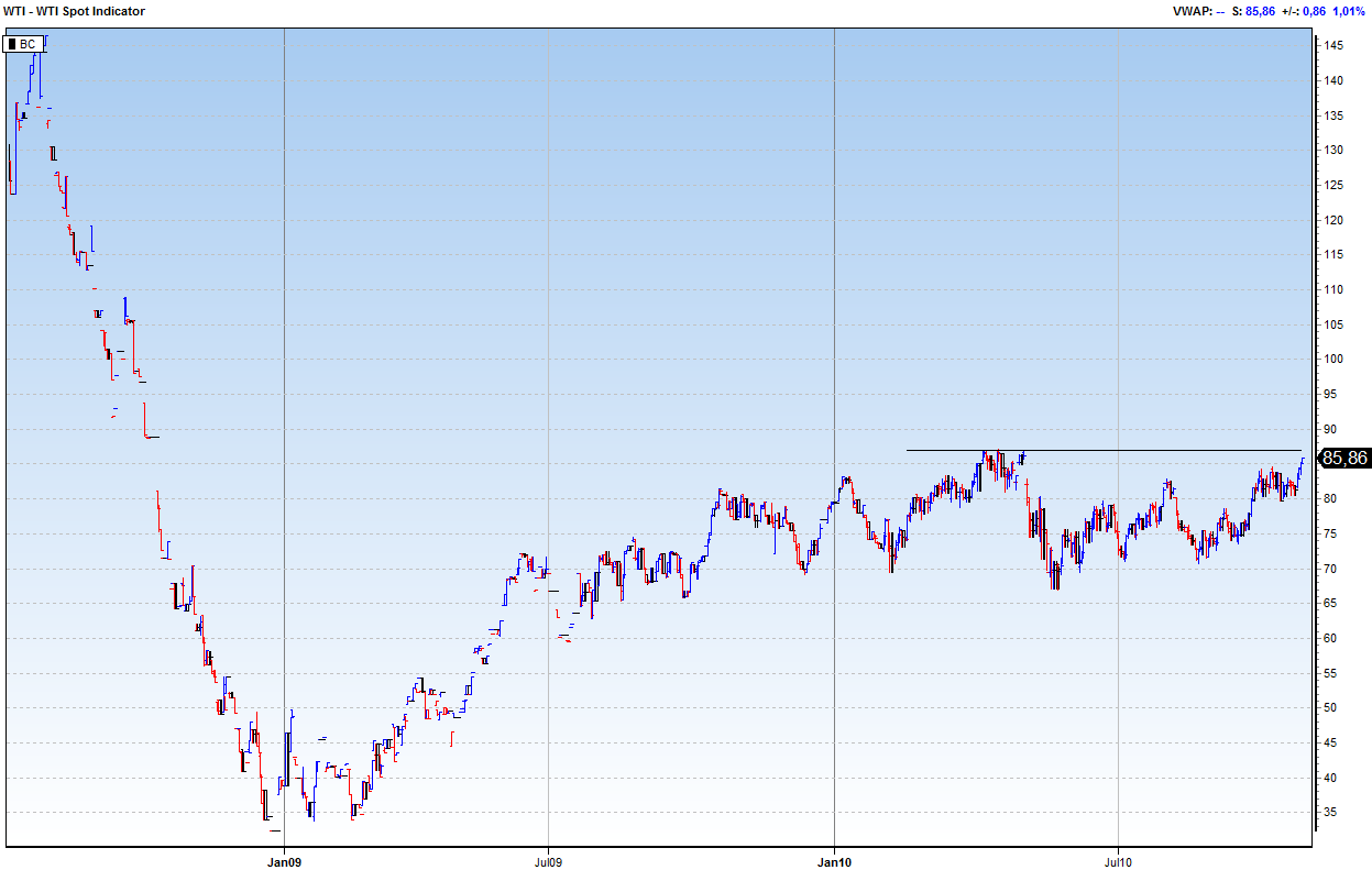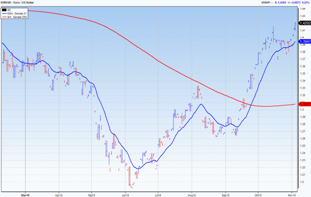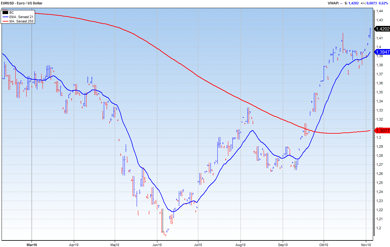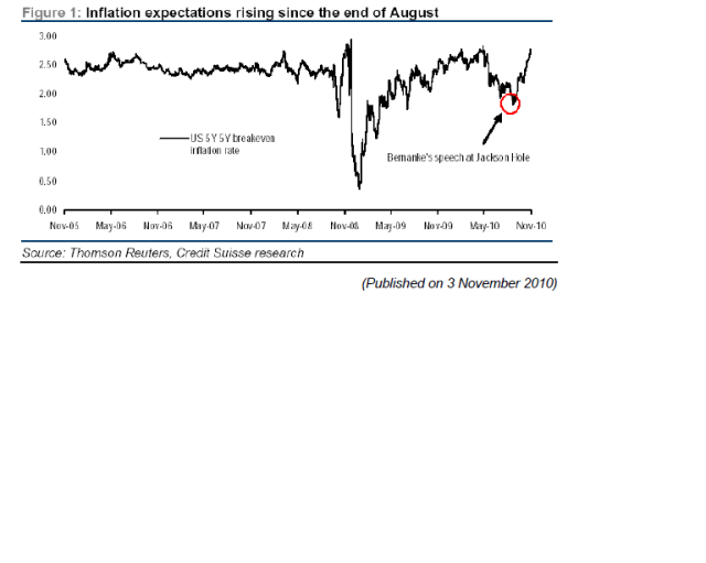 FED vill åstadkomma två saker 1, försvagning av dollarn och 2, få ner räntorna, och därigenom orsaka ASSET INFLATION. Om man tittar på chartsen ovan så lyckas de uppenbarligen. Dollarn ner, räntan ner, asset inflation upp.. QE2 fungera. Sen om det fungerar till att på sikt hjälpa den amerikanska ekonomin att lyfta är en annan femma!