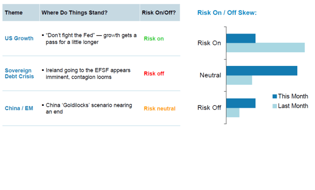 De tycker risk/reward har ökat och tar därför ner risken, vilket innebär att sälja EM. de främsta riskerna är 1, Inflation i EM och 2, Default i Piigs….. det som talar för att man ska ta risk är 1, QE och 2, ledande makrodata faktiskt har överraskat positivit i USA de senaste månaderna.