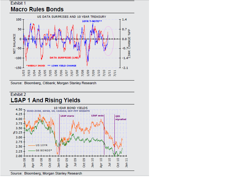 Charten nedan visar att FED och QE2 i all sin ära, men det som driver räntor in the end of the day är tillväxt i ekonomin. Tillväxt driver inflation, och så länge som Centralbanker har inflationsmål så kommer denna komponent att styra styrräntan. Punkt. Chart nr2 visar att reaktionerna inför och efter QE2 känns igen från 2008. Det intressanta är kanske frågan; Vad hade hänt om Bernanke INTE gjort något alls?!?! Lite som att säga, Vad hade hänt om Bush inte plockat bort Saddam?