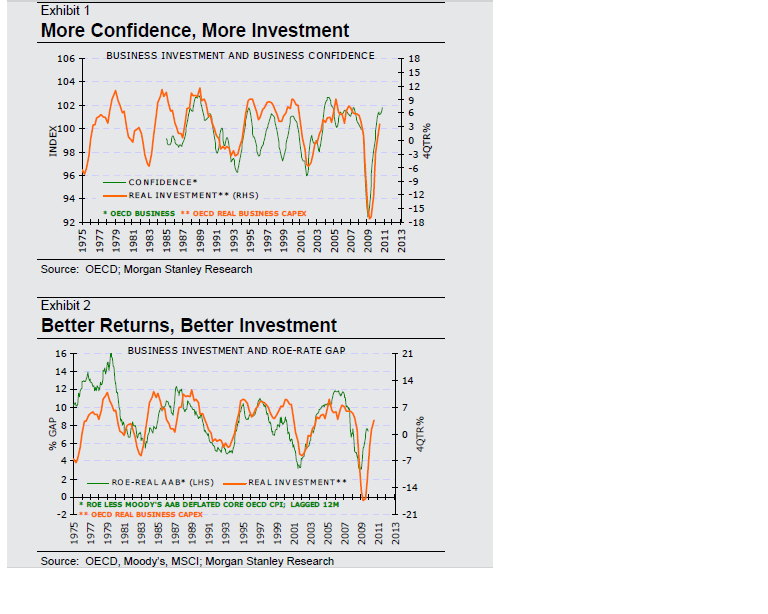 Graferna nedan visar hur Business Confidence, och ROE-kapital kostnad driver Cap ex. Det är logiskt, när du får möjlighet att göra en investering som har hög ROE potetial samtidigt som dina lånekostnader är låga samtidigt som du har förtroende för framtiden… ja, då vågar man satsa!!!