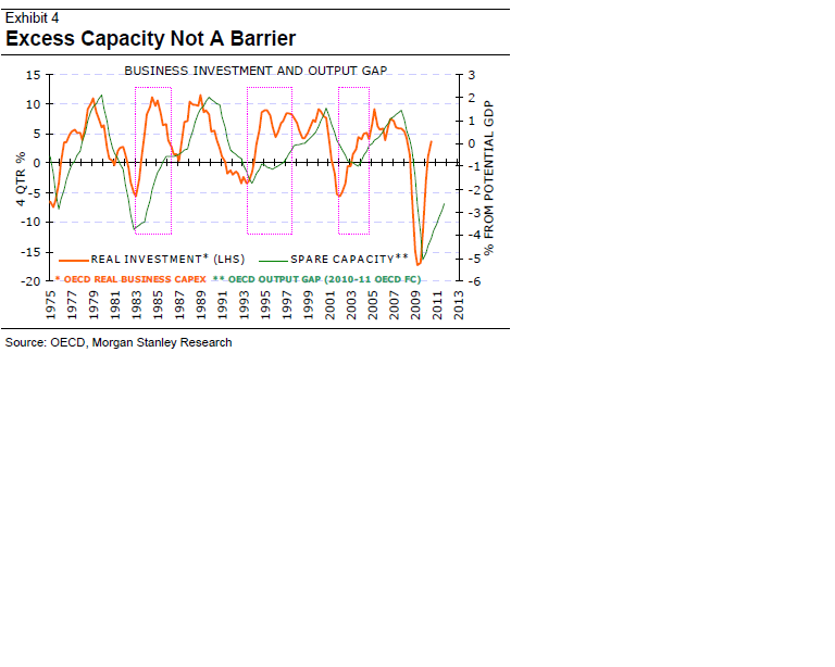 MS lyfter fram det faktum att företag har hållt tillbaks capex spending de senaste åren. Tittar man på Kapacitetsutnyttjandet så är det fortsatt lågt i USA, men å andra sidan så tillverkas de flesta billigare varor i Asien. Cap Ex för USA är snarare inom andra saker än ren produktionskapacitet. CapEx i servicesektorn driver sysselsättning därför är det uppmuntrande att se följande charts.