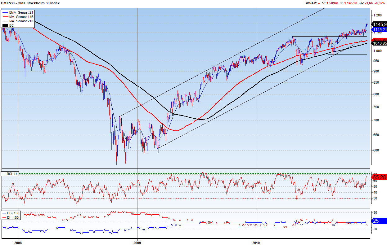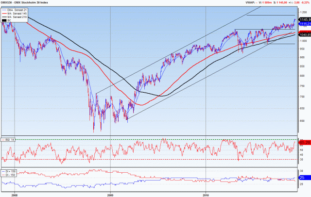 Mitt korta mål på OMXS30 har varit 1180 +- 10 punkter. Det målet är intakt. Efter detta hägrar det stora målet 1280+-10p. Att vi skulle fortsätta dit på hausse ångerna utan någon postivt fundamenta känns osannlikt i nuläget. Vi får se hur det går vi första motståndet helt enkelt.