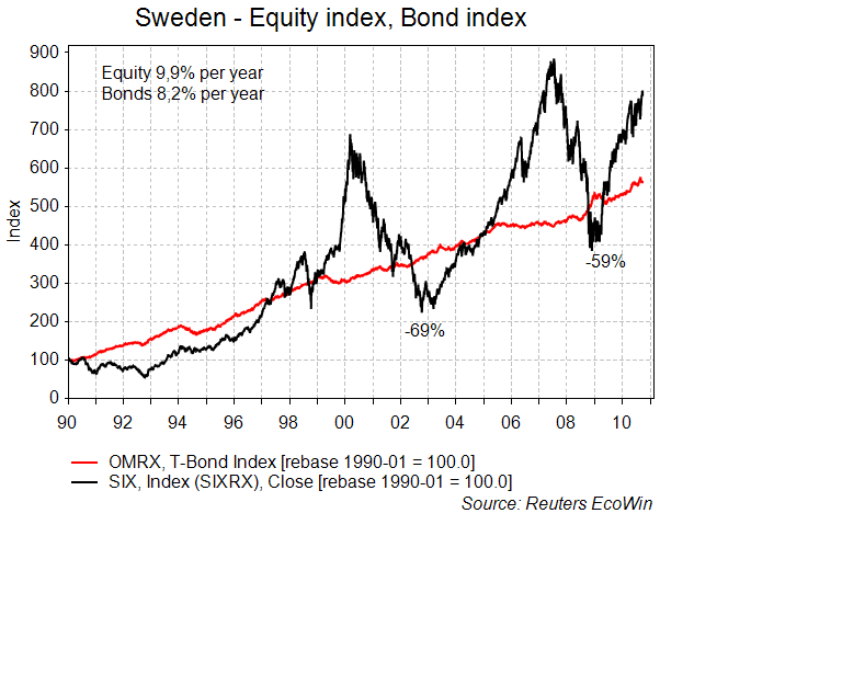 Långsiktit har Svenska aktier haft en dålig riskpremie jmf med obligationer… talar för en fortsatt bra börs!
