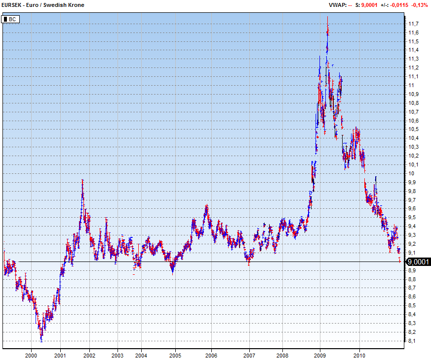 Euron gick precis under 9kr för första gången på 4 år. Frågan är hur mycket elände som är inprisat. Visst, PIIGSEN(B) kommer inte vara i Full Högkonjunktur och Happy Times om 12 månader, men jag är rätt säker på att marknaderna för länge sen prisat in problemen och dragit vidare och fokus är på helt andra saker…. eller vad tror ni?