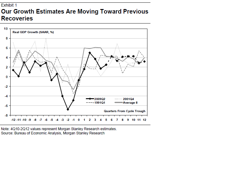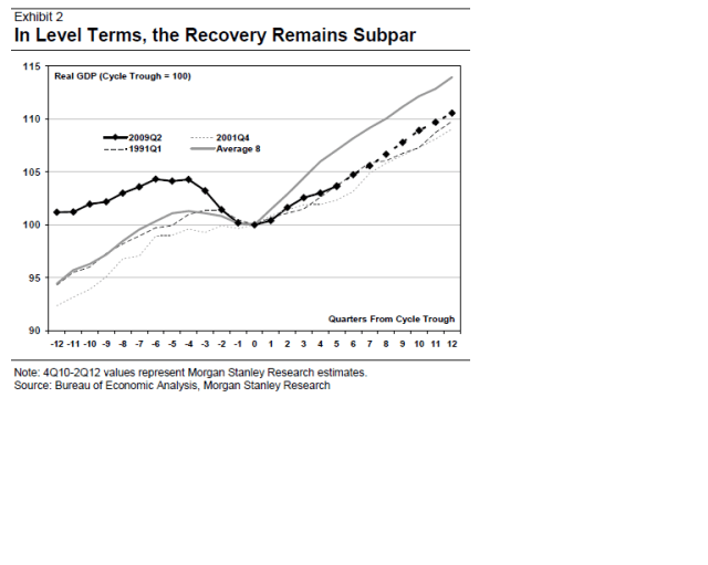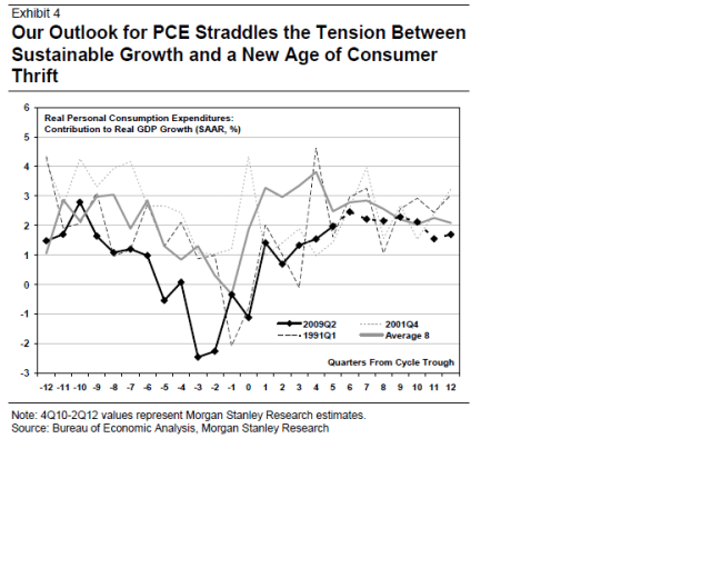 Precis som alla andra väntar sig MS att PCE, dvs privatkonsumtion, cap ex och export ska leda tillväxten nästa år i USA. MEn fortfarande är det en slö recovery, med likheter med 1991 och 2001.
