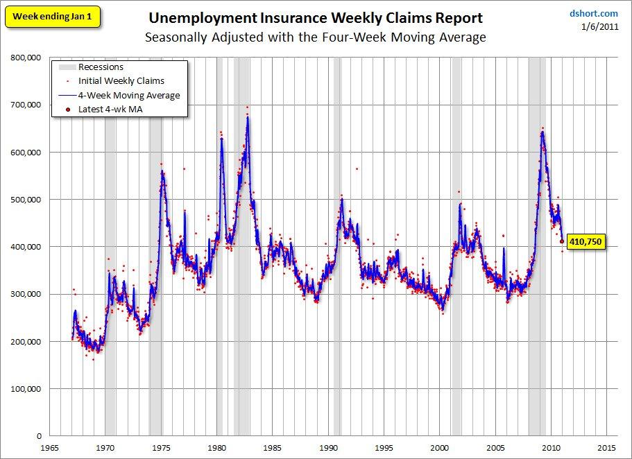 Se chart nedan. Jämför man med förra konjunktursvackorna kan man konstatera 2 saker. Den här svackan har varit betydligt djupare än de två tidigare och redan sent 1993 och 2004 hade jobbless claims repat sig mot 350,000. Där är vi ännu inte! Det betyder att återhämtningen i arbetsmarknaden än så länge går segare än vad den gjorde de senaste två gångerna.