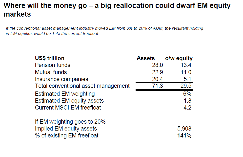 Nedan är lite flummigt, men den säger ungeför att västvärldens traditionella kapitalförvaltare (pensions funds, Mutual funds, Insurance companies) har 6% i EM. Om de hypotetiskt skulle öka den vikten till 20% av den totala aktieexpoeringen… så är den summan som det ska köpas aktier för lika stor som 140% av feefloaten i EM… Alltså den kan bli trångt i dörren… dvs potentiell värderingsbubbla på sikt!