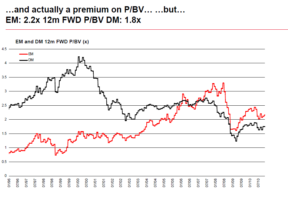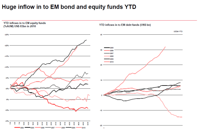 och flödena finns där!!! (men glöm inte att bakom varje köpt aktie finns en säljare!). För att västvärldens kapitalförvaltare ska göra det måste de få fram pengar, de måste sälja nåt för att köpa nåt annat… de kommer sälja DM Debt, dvs Amerikanska och Europeiska statspapper… vad händer då? Jo räntorna far upp i luften. Men om de säljer räntepapper.. så måste ju någon köpa… ja troligtvis är det rika EM länder som kommer uppskatta att man får 7% avkastning på en 10-årig US bond… risken är alltså överhängande att EM kan driva upp räntorna i väst! Vilket gör de överbelånade konsumenterna ännu fattigare….. eller? En rikare EM konsument vill ha BMW, Ralph Lauren eller rent utan Pampers…. grejorna tillverkas där borta, men vinsterna hamnar hos oss. Världen är ganska så komplex!