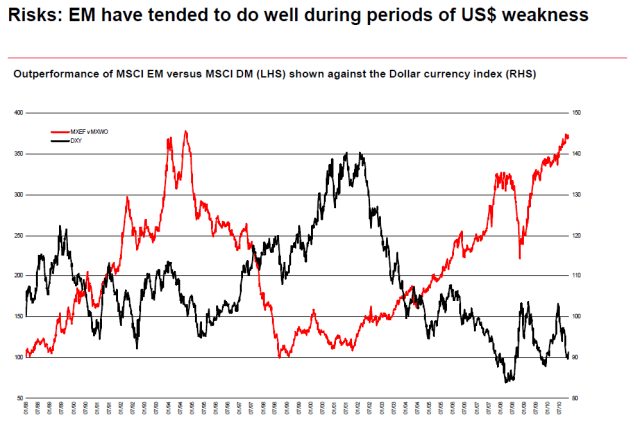 En svag dollar ger höga råvarupriser, som gynnar EM vs DM