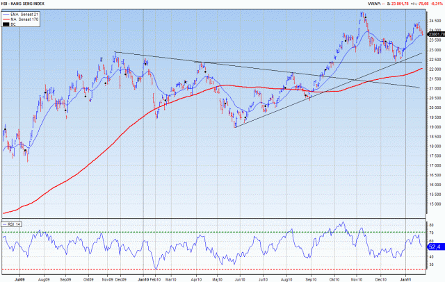 Asien var blandad kompott, trots GE starka rapport i fredags och starka råvaror genrellt. tittar man på Hang Seng så har vi noterat en lägre topp, och det finns likheter med utvecklingen under nov09-jan10 tycker jag (eftersom jag fiskar efter rekyl 🙂 ). Någon som är mer bullisk ser säkert nåt annat!