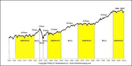 Nedan har jag visat många gånger. Det är att kraftiga bull markets efterlevs att 20-åriga Sidewaysmarkets. Vissa hävdar att Bullmarketen 1982-2000 (18 år) ska efter levas av en sideways market i 20 år (2000-2020). Det här typen av resonemang har jag aldrig gillat egentligen då mycket går att förklrara med 1, vinstutveckling 2, inflation/ränta samt 3, värderingar… snarare än att de bara SKA VARA ETT HISTORISKT MÖNSTER som går igen och igen och igen…. som om det vore en klocka!