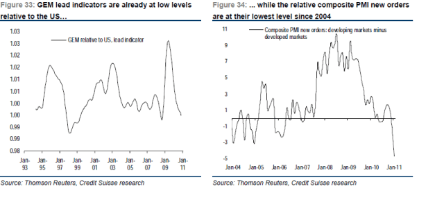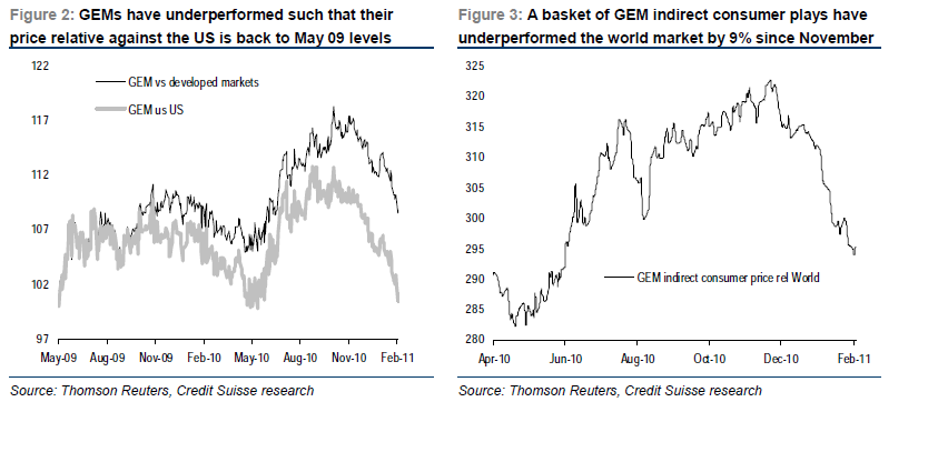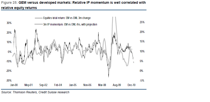 Tillväxtmarknander har gått ganska knaggligt (undantag Ryssland) i jämförelse med DM, främst USA och Tyskland, de senaste månaderna. CreditSuisse tror att detta kan fortsätta i ytterlilgare några månader… de baserar detta på taktiska skäl, och inte strategiska där EM naturligtvis fortfarande är överlägset.