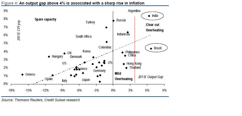 problemet i EM är att outputgap är litet eller positivt samtidigt som vi har stigande matpriser… detta skapar inflation. DM största problem är i framtiden högre räntor som kommer lägga sordin på konsumtion då pengarna kommer gå till räntekostnader.