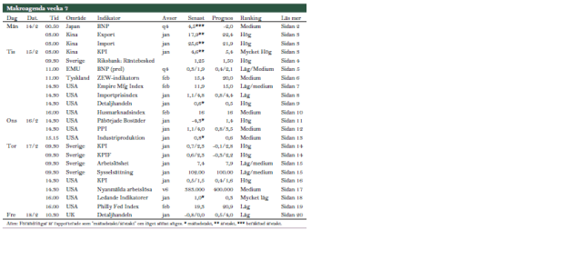 Nästa vecka är lite blandad kompott. Egypten är i fokus, samtidigt som rapportsäsongen börjar spela ut sin rätt. Kinas KPI siffror, Amerikansk detaljhandel och US KPI kan kanske vägleda markanden? OMX30 toppen på 1182 känns mer avlägsen än stödet vid 1080 om man säger så…. vi får helt enkelt avvakta utvecklingen!