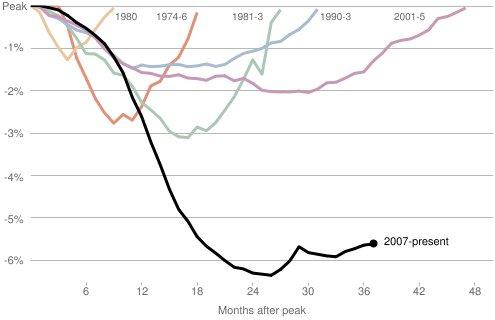 Men än är vi inte där som chartet visar… jobless growth så långt. Men om man jämför med sist (även om skillnaderna är stora) så hände ingenting under 2004, och huxflux återvände confidence under 2005 och man tog igen hela tappet på 1 år. Alla jobb som försvann under 2001-2004, kom tillbaks på ett år. Minst sagt otroligt.
