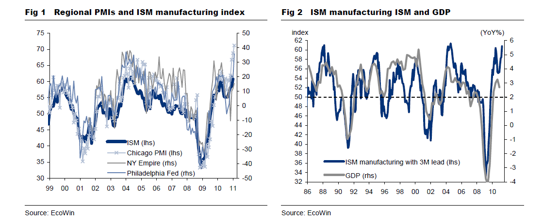 Chicago PMI var urstark igår… samtliga lokala index pekar faktiskt på en ISM siffra i eftermiddag kring 65, snarare än konsensus 60,8. En sån stark siffra implicerar att BNP tillväxten ska upp mot 6%+ i år. Det skulle också innebära att sysselsättningen kommer komma skjuten som uren kanon vilken dag som helst. Nån som känner nån som letar jobb i USA för tillfälligt? Hade varit intressant med lite verklighets feedback. Känns minst sagt otroligt om detta stämmer. Studerar gärna nedan!
