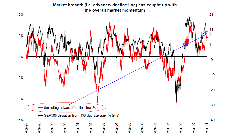 Market breadth… dvs antal aktier som går upp i förhållande till aktier som går ner har precis toppat ur. Det betyder att det finns klart mer på nedsidan!