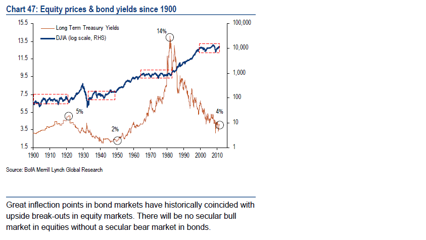 En sak är säker… vi kan ALDRIG få en äkta BULL market på aktier, om vi INTE får en äkta BEAR market på BONDS…. räntorna måste tids nog börja stiga… då stiger även DM aktier! Vad försöker jag säga? Jo antingen tror du på stigande räntor (dvs stigande inflation och ekonomisk tillväxt) och därmed kommer aktier stiga… ALTERNATIVT tror du inte på högre räntor (och således ingen bra konjunktur) och därmed ingen uthållig uppgång på aktier.