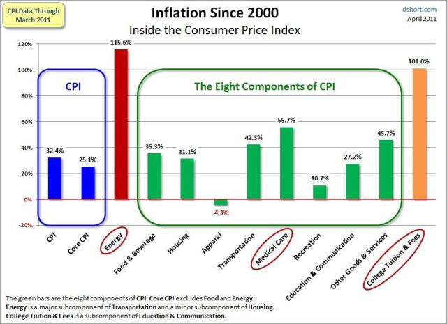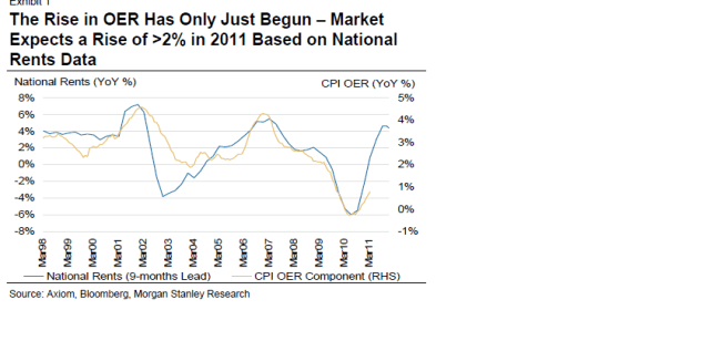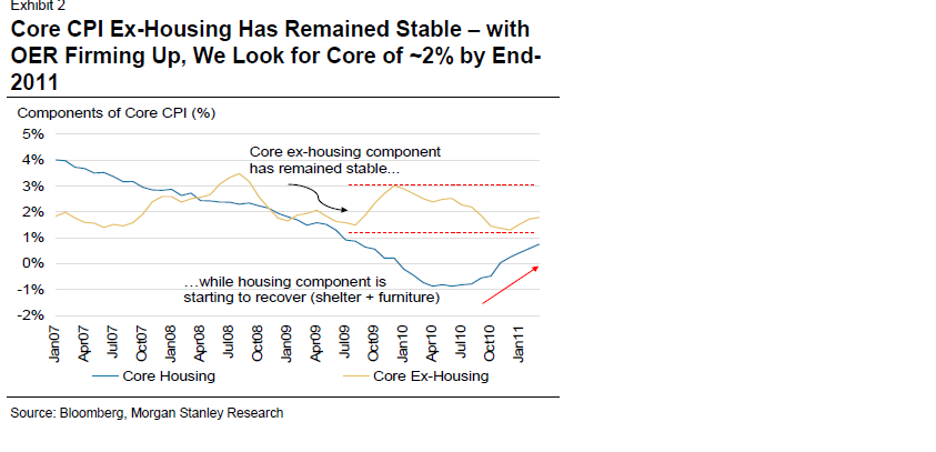 så lagom till att mat- och energi priser lugnar ner sig under 2H11 (som är deflatoriska då de inte driver upp lönerna) ja då kommer något ännu värre, boendekostnader, som exempelvis hyror. Högre hyror gör alternativ boendet, dvs äga sitt boende, mer intressant vilket kan få huspriserna att gå upp, vilket kan leda till ökad utlåning, vilket leder till ökad konsumtion… och vips börjar vi få lite lönebildning, och vips börjar vi se core inflation stiga på riktigt. Men detta sker, tack och lov, inte över en natt.