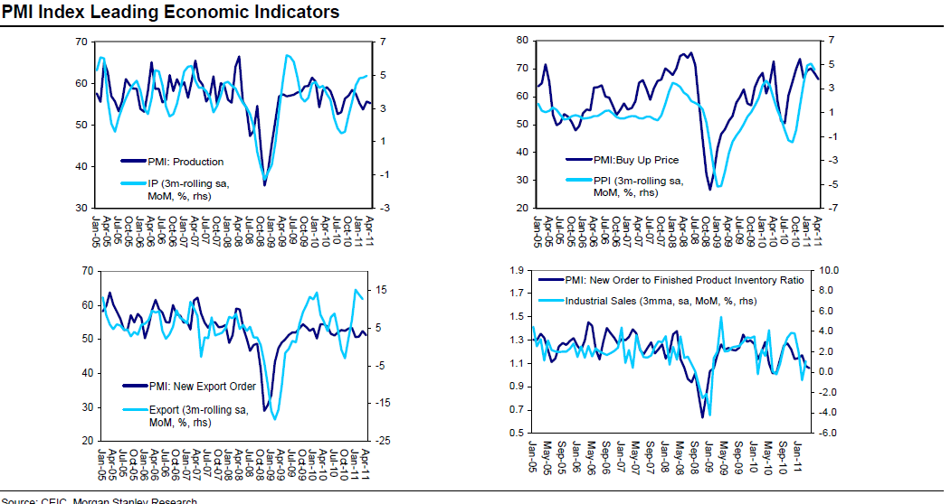 China PMI kom igår. Priskomponenten är intressant då den flaggar för ett lite lugnare tempo på PPI! Se nedan övre högra chartet. Även de andra komponenterna flaggar för ett lugnare tempo längre fram för IP, export och industrial sales. Inte kul för råvarupriser säger jag!