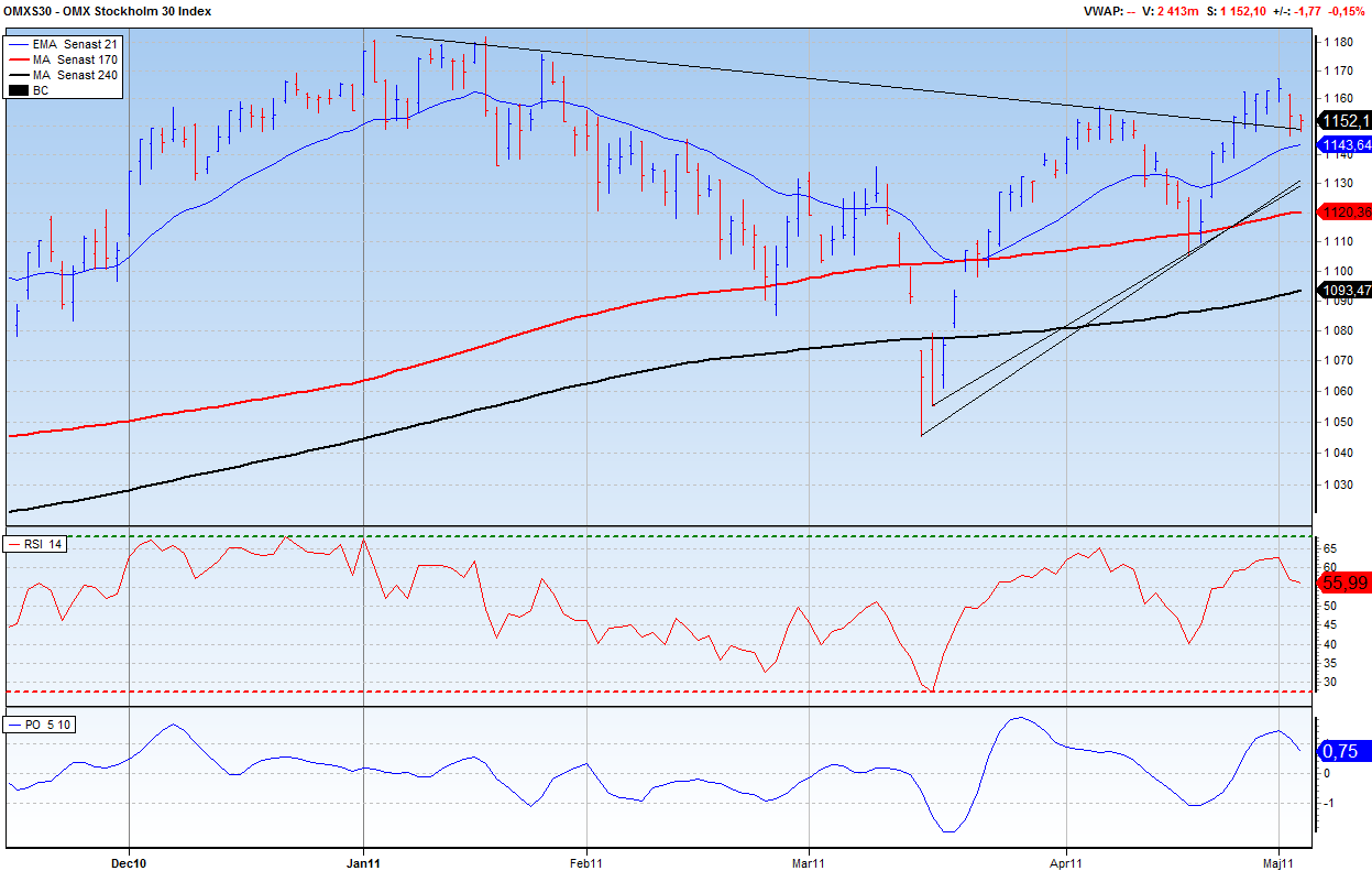 Var står vi nu? Jag tror att Svenska börsen, i likhet med de flesta andra, rekylerar något för att samla kraft mot en förnyad attack mot den gamla toppen på 1182!