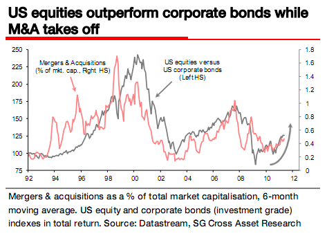 SG, societe general har en stor rapport ute… de är bullish on aktier över bonds pga att antalet M&A tappas upp… ett samband jag faktiskt inte brukar titta på. Men visst finns det en logik.