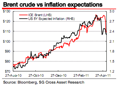 De menar också att det är viktigt att titta på inflationsförväntningarna i USA (här illustrerat som spreaden mot den den 5-åriga REAL obligationen) för att förstå hur olja och dollarn ska gå…