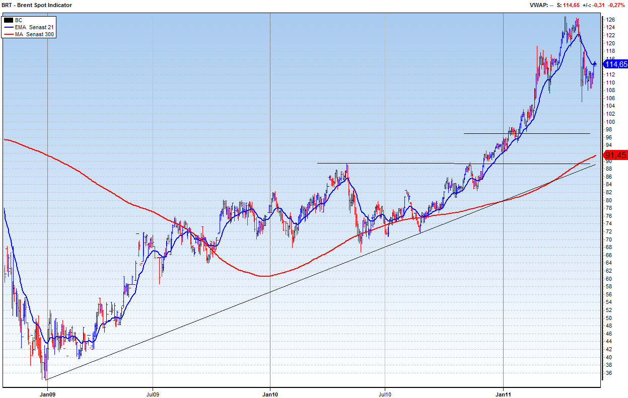 Vilket naturligtvis har med oljan att göra. Frågan är, hur stor är MENA premien? 10$ eller 20$… jag tror vi ska under 100 innan det är över. fler och fler hus tror på under 80 med tanke på Kina slowdown, QE2 Exit och dollarförstärkning (även om en del borde vara inprisat). Det är bara Tier 1, typ Goldman mfl, som haussar. antar att det har rätt stora possar inne. Olja under 100 är good news för de flesta männsikor och företag på vår jord, glöm inte det!