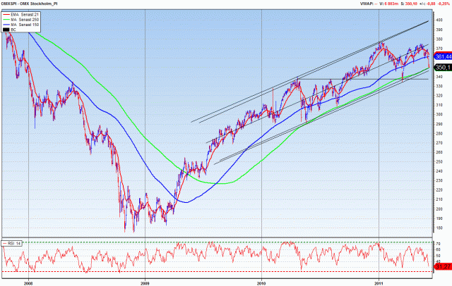 Å andra sidan har jag säkert fått 3 rapporter senaste veckan där man pushar för Defensives över Cykliskt.. och där man konstaterar att den traden har fungerat ypperligt i USA, men inte alls i Europa, och därför skulle det bara vara en tidsfråga innan det kom till Europa, vilket skulle innebära att man säljer cykliskt, dvs Svenska marknaden! Men jag vet inte… Kina bromsar samtidigt som våra verkstadsbolag inte flaggar för sämre vinster. 2012 lär bli hyggligt för Kina. Svensk verkstad, SX20, är ner 10% sedan årsskiftet… det räcker kanske?