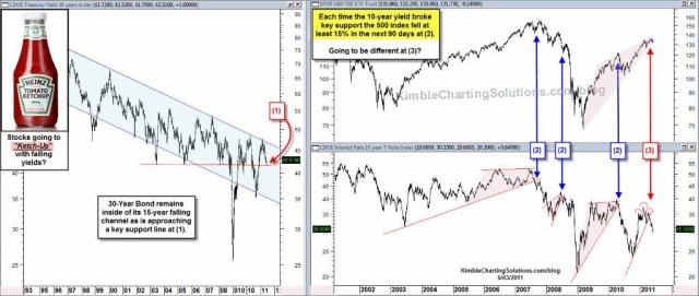 de flesta verkar överrens om att det lilla bondrally vi sett sedan februari (och SPX har gått motsdatt väg, dvs ganska dåligt) är på väg att ta slut. Det vill säga att aktier börjar bli attraktivt och bonds oatraktivt. Sist QE1 löpte ut föll även räntorna. De började stiga när man lanserade QE2. Resonemanget är att man vill sälja sina bonds till FED (som köper) och ta risk i aktier. När FED slutar köpa, då blir marknaden köpare istället. FEDs agerande i QE manar till risk tagande. Agerar inte FED vill inte marknaden ta risk. MEN nu lutar mycket åt att det inte blir QE3, pga Core inflation och Jobbskapande ser bättre ut idag än under sommaren 2010. Kommer då aktier att gå ner? Nedgången vi sett sedan februari i aktier (och uppgången i bonds) handlar i mångt och mycket om en inprisning av att QE2 ska löpa ut. Hur kommer en inprisning av en utebliven QE3 se ut? Om konjunkturen gör en sk. soft patch under resten av året, samtidigt som ledande indikatorer flaggar för ett okej 2012, sysselsättningen blir i snitt 150,000+, vinsterna håller uppe hyggligt samt priset på bensin sjunker tillbaks… ja då skiter nog marknaden i QE3 faktiskt. Om vi tvärtom får en deflationstendener, vinsternna börjar gå ner, inga jobb skapas och de ledane indikatorerna inte bottnar och vänder upp… ja då surnar marknaden. MEN då lär Bernanke komma till vår räddning med ytterligare paket, dvs QE3. Det lär glädja marknaden åtminstone kortsiktigt. På lång sikt måste det få komplikationer för dollarn… men det är en annan story!