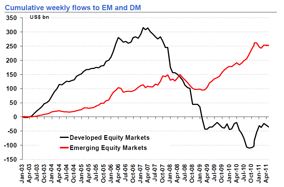 Flödesmässigt är det fortfarnade lite dassigt i EM… men ser man till den stora bilden attraherar de fortfarande bra med flöden även om det varit ganska flat senaste halvåret. Däremot så kan man konstatera att de pengarna som flöt ut ur DM fonder sedan 2007 inte kommit tillbaks. EM har tagit en liten bråkdel, men majoriteten ligger i cash och obligationer. Hör man efter på stan går bond avdelningarna lysande, och privatebankers köper hellre corp bonds än equity. Det gör mig konfident att aktier har en bra bit att gå i det längre perspektivet, just av den anledningen att det inte är en crowded trade.