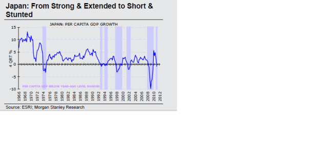 Nedan chart visar hur Japan gick från nästan 18 års oavbruten tillväxt till stagnation