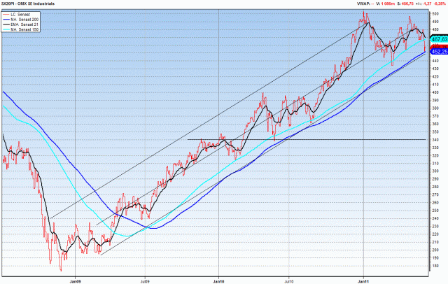 Nedan chart är SX20, dvs index över Svenska verkstadsföretag, som tidigare har varit en god indicator över världskonjunkturen. Den toppade 3 januari, och handlas idag 10% lägre. Den handlas flat på 6 månader. Man kan säga att den har sedan en tid prisat in att konjan skulle gå in i ett lugnare tempo. Min syn är att den prisat in en soft patch och Q411 return to recovery scenario. MEN skulle ledande indikatorer fortsätta att falla och inte bottna, sysselsättningsdatan inte repa sig osv. finns det risk att den här fina trenden kan brytas. När långa trender bryts gillar marknaden att korrigera 50% ungefär. Det skulle betyda att Svenk verkstad skulle kunna tappa 20-25% om det vill sig riktigt illa. Detta är inte mitt huvudscenario som de flesta vet… men det kan vara värt att ha i åtanke!