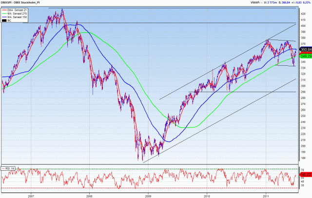 Tror det blir en ganska lugn tid framöver. Idag kommer den stora sysselsättningssiffran… den kan nog hjälpa eller stjälpa det rally vi sett senaste dagarna. Under juli kommer fokus riktas mot Q211 rapporterna, men jag tror dock inte de är startskottet på någon ny trend. Även Kina datan i nästa vecka är viktig, men troligtvis ingen kioskvältare. Den här perioden fram till september/oktober brukar inte trenda. Jag utgår från att vi rör oss i intervallet som är uppritat nedan…. bra nyhetr tar oss mot topparna kring 370-380… dåliga nyheter tar oss mot bottnarna 330-340.