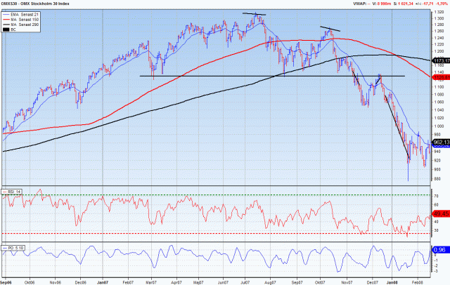 Den tekniska bilden är som tidigare sagt, jobbig. Börsen brukar vara köpvärd vid 4 av 5 tillfällen när den dippar till så här, så länge som trenden är stigande. Det är tyvärr det femte sista tillfället, som man INTE ska köpa på. Svårt att veta vilket det är dock 😉