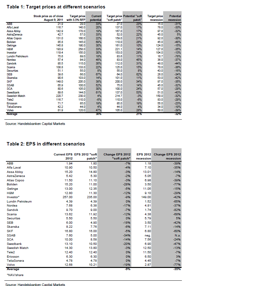 Jag trodde aldrig att vi skulle bryta ner ur intervallet, då jag inte trodde att marknaden tänkte prisa in RECESSION. Jag trodde inte marknaden skulle göra det eftersom det inte fanns några tecken på RECESSION, utan bara soft patch LTG. Men med tanke på vad som händer i världen, så valde alltså marknaden att ta det säkra före det osäkra, och börja prisa in RECESSION, då det finns en risk att dagens händelser gör att soft patchen just övergår i RECESSION. Om marknaden skulle börja överge den tanken, och börjar tro mer på LTG utan recession, då kommer vi alltså att få se en återhämtning mot det gamla intervallet. Alternativet är att vi börjar få signaler om analkande RECESSION, då finns det fortfarande en betydande nedsida på börsen. Idag befinner vi oss någonstans mittimellan. Enligt banken prisar vi in 30% vinstförsvagning under 2012 på dagens nivåer.