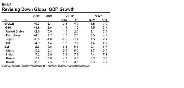 Men tveklöst är det så att senaste tidens händelser har fått ekonomerna att skruva ner estimaten. Nedan MorganStanleys senaste, vilekt dem kallar ”Dangerously close to recession” eller LTG som jag brukar säga! Hursomhelst, bnp nedgraderingar leder till salesnedgraderingar som leder till Earningsnedgraderingar, alltså neg revisions. Då garanterar inte att börsen ska gå ner, men det brukar sällan vara ett bra köpläge. Jag är fortsatt NEUTRAL (helt enligt https://kortsikt.wordpress.com/2011/08/09/tva-skolor-och-en-lagom/)