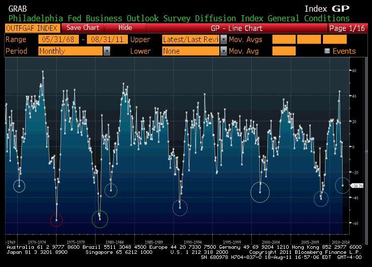 Man kan ha många synpunkter på gårdagens Philly Fed. Många tycker inte man ska hänga upp sig på en data, under en månad. Ligger kanske nåt i det? Vissa hävdar att höga bensinpriser, följdeffekter av Japan och det politiska bråket i Washington med efterföljande ratecut gör att siffran var onaturligt låg…. kanske det? MEn faktum är att sedan 1960 har en siffra under 30 ALLTID triggat recession.. i 8 fall av 8 faktiskt!